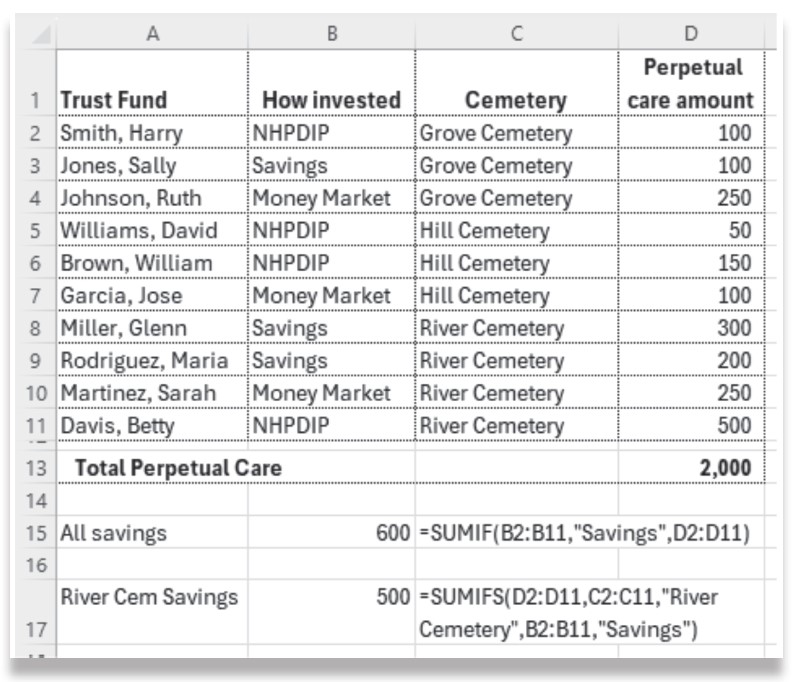 Sumif and Sumifs are formulas that will total the amounts in one column or row which meets the criteria of another column(s) or row(s). Let’s say your spreadsheet of Perpetual Care accounts has columns for the trust name, how it is invested, which cemetery that plot is located in, and the principal amount of the fund. Using Sumif, you can total the perpetual care amounts for the criteria of another column, such as how invested. The formula looks like =Sumif(range, criteria, sum_range). Using Sumifs, you can total the perpetual care amounts for multiple criteria, such as how it is invested for plots in a specific cemetery. The formula looks like =Sumifs(sum_range, criteria_range#, criteria1, criteria_range2, criteria2). In these formulas range or criteria_range# is the area you are searching for a particular criteria such as the column that says how invested or which cemetery. Criteria or criteria# refers to what you are looking for, such as Savings or River Cemetery. Sum_range is the area you have the amounts.